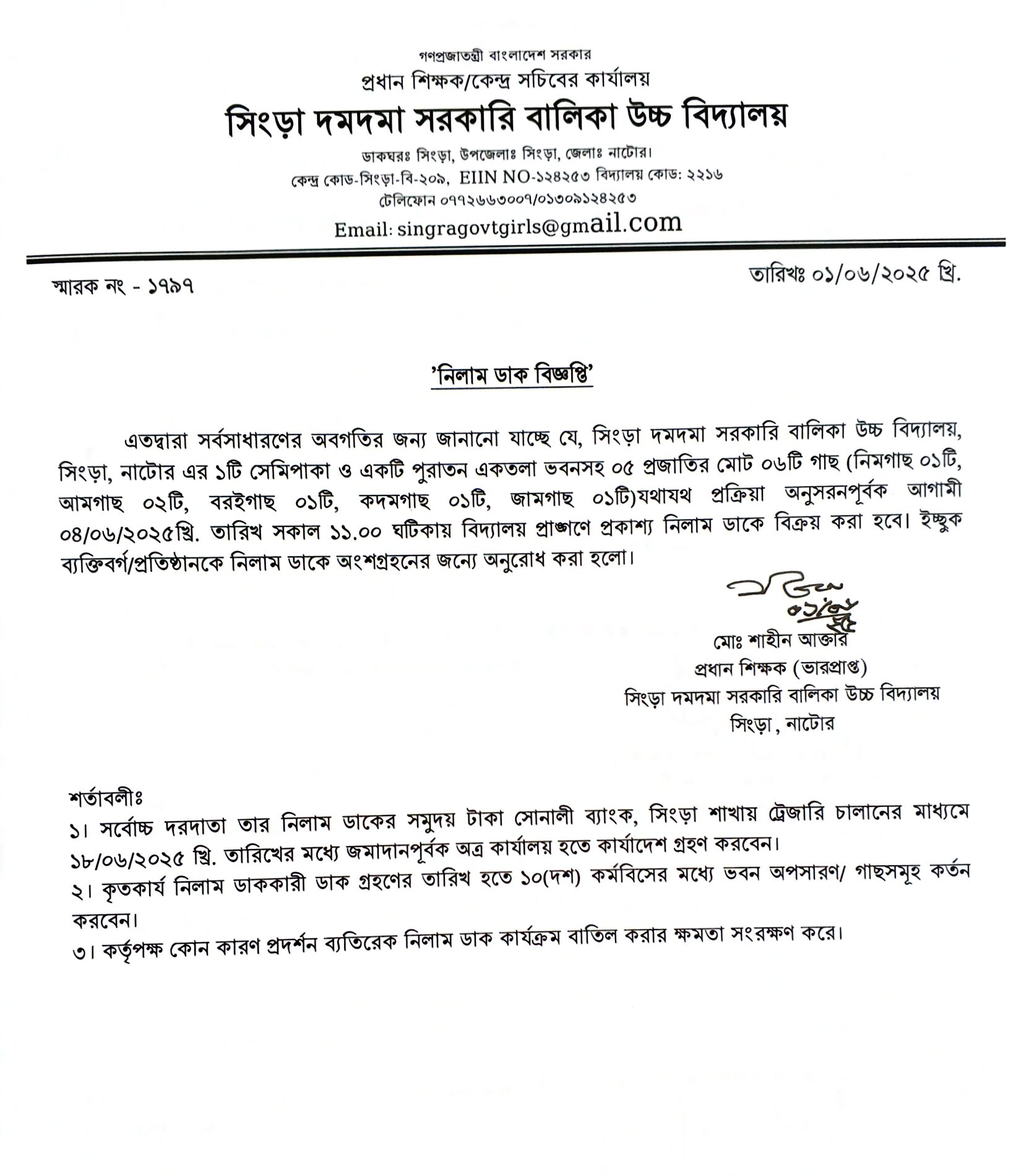 এতদ্বারা সর্বসাধারণের অবগতির জন্য জানানো যাচ্ছে যে, সিংড়া দমদমা সরকারি বালিকা উচ্চ বিদ্যালয়, সিংড়া, নাটোর এর ১টি সেমিপাকা ও একটি পুরাতন একতলা ভবনসহ ০৫ প্রজাতির মোট ০৬টি গাছ (নিমগাছ ০১টি, আমগাছ ০২টি, বরইগাছ ০১টি, কদমগাছ ০১টি, জামগাছ ০১টি) যথাযথ প্রক্রিয়া অনুসরনপূর্বক আগামী ০৪/০৬/২০২৫খ্রি. তারিখ সকাল ১১.০০ ঘটিকায় বিদ্যালয় প্রাঙ্গণে প্রকাশ্য নিলাম ডাকে বিক্রয় করা হবে। ইচ্ছুক ব্যক্তিবর্গ/প্রতিষ্ঠানকে নিলাম ডাকে অংশগ্রহণের জন্য অনুরোধ করা হলো।